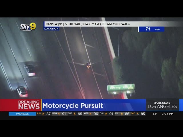 Title: Authorities detain pursuit suspect riding motorcycle following lengthy chase from Riverside to Long