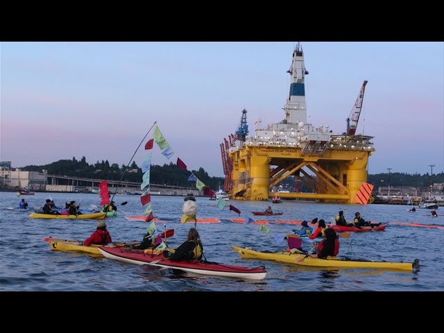 Title: "Battling the Death Star": Seattle "Kayaktivists" Slow Arctic-Bound Shell Oil Rig as Fight Goes On