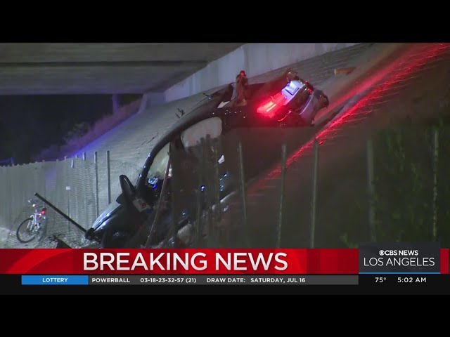 Title: Car drives off 105 Freeway embankment, killing one and critically injuring another in Lynwood