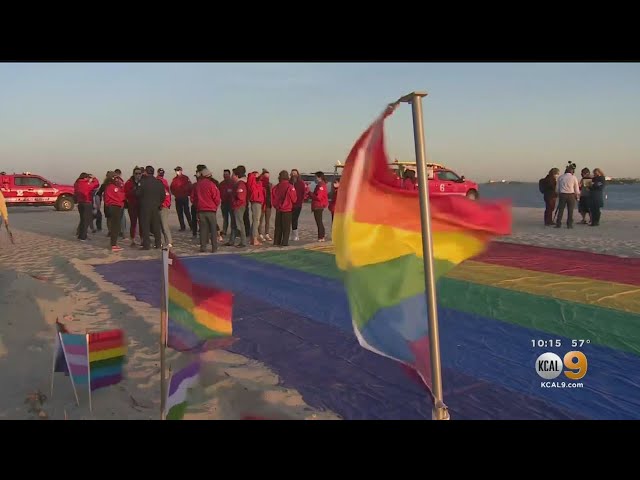 Title: Crowd Gathers Around Site Of Torched Long Beach Lifeguard Tower In Support Of LGBTQ+ Community
