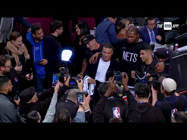 Kevin Durant and Kylian Mbappe share a moment after Nets' win