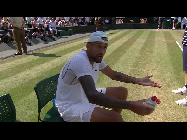 Nick Kyrgios yells at his box during a break