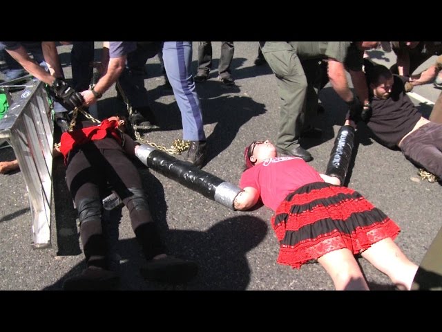 Title: #StopTrump Protesters Lock Themselves to Ladders to Block Traffic Outside Trump Rally in Washington