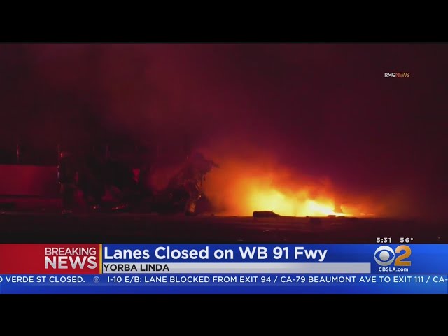 Title: Traffic backed up for miles after fiery big-rig wreck on 91 Freeway in Yorba Linda leaves one dead