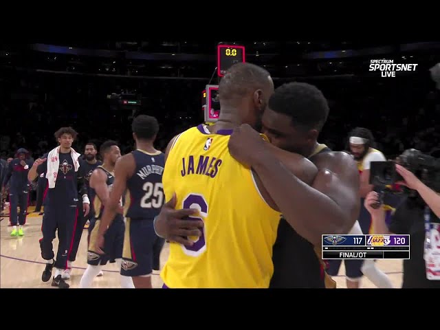 Zion & LeBron share a hug at half court after overtime TH...